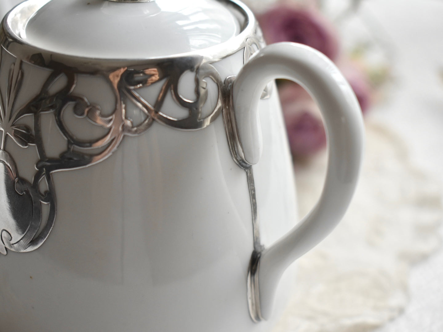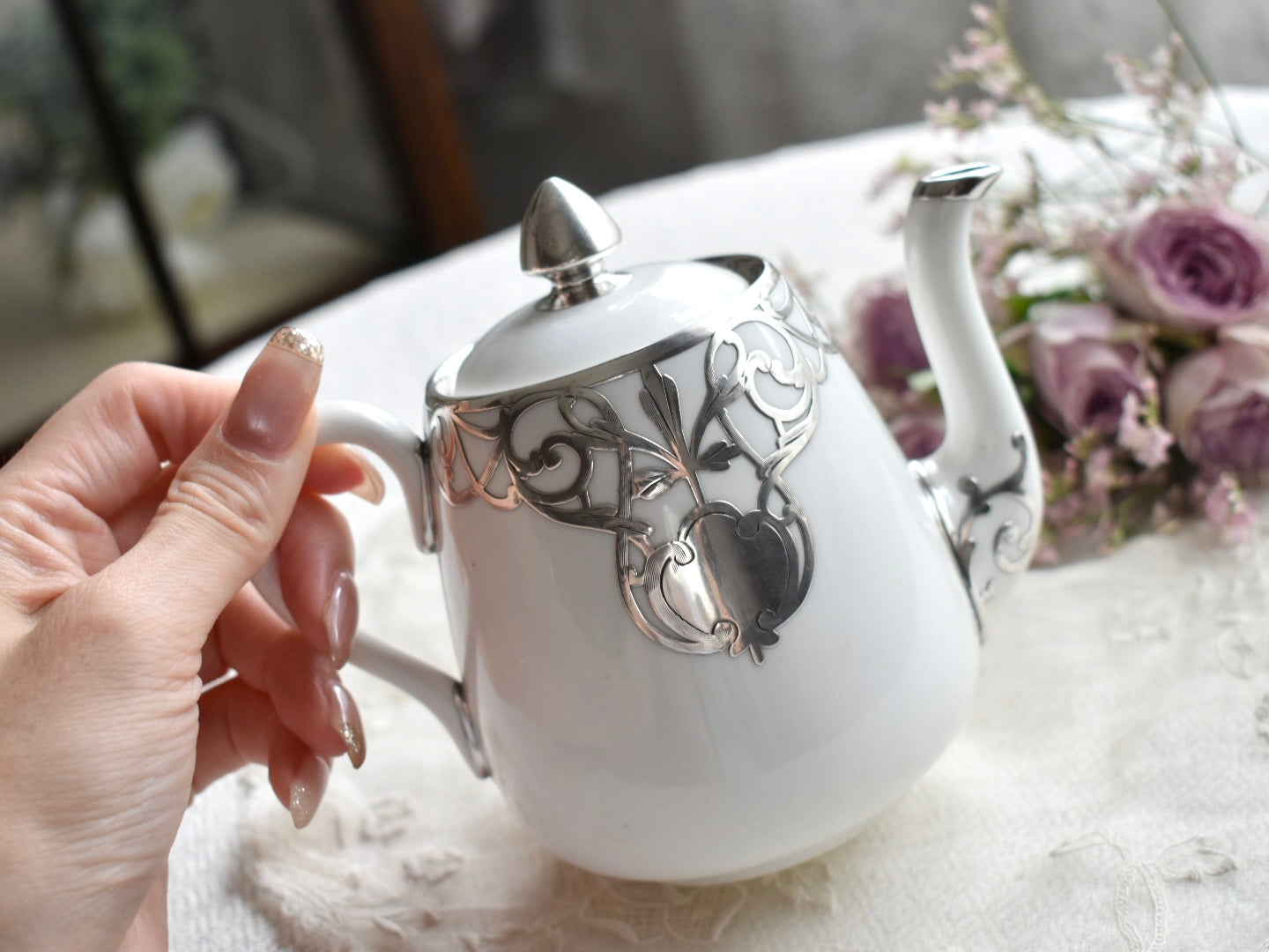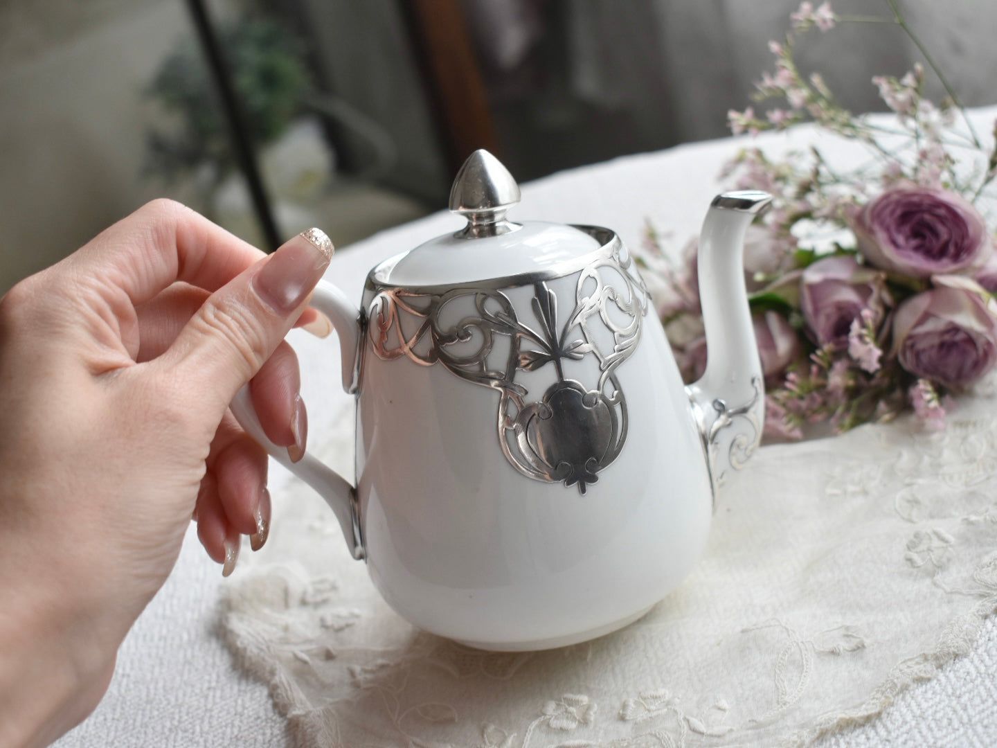 サイズは小さく、小ぶりなポット。丁寧にシルバーオーバーレイの細工が施されています。