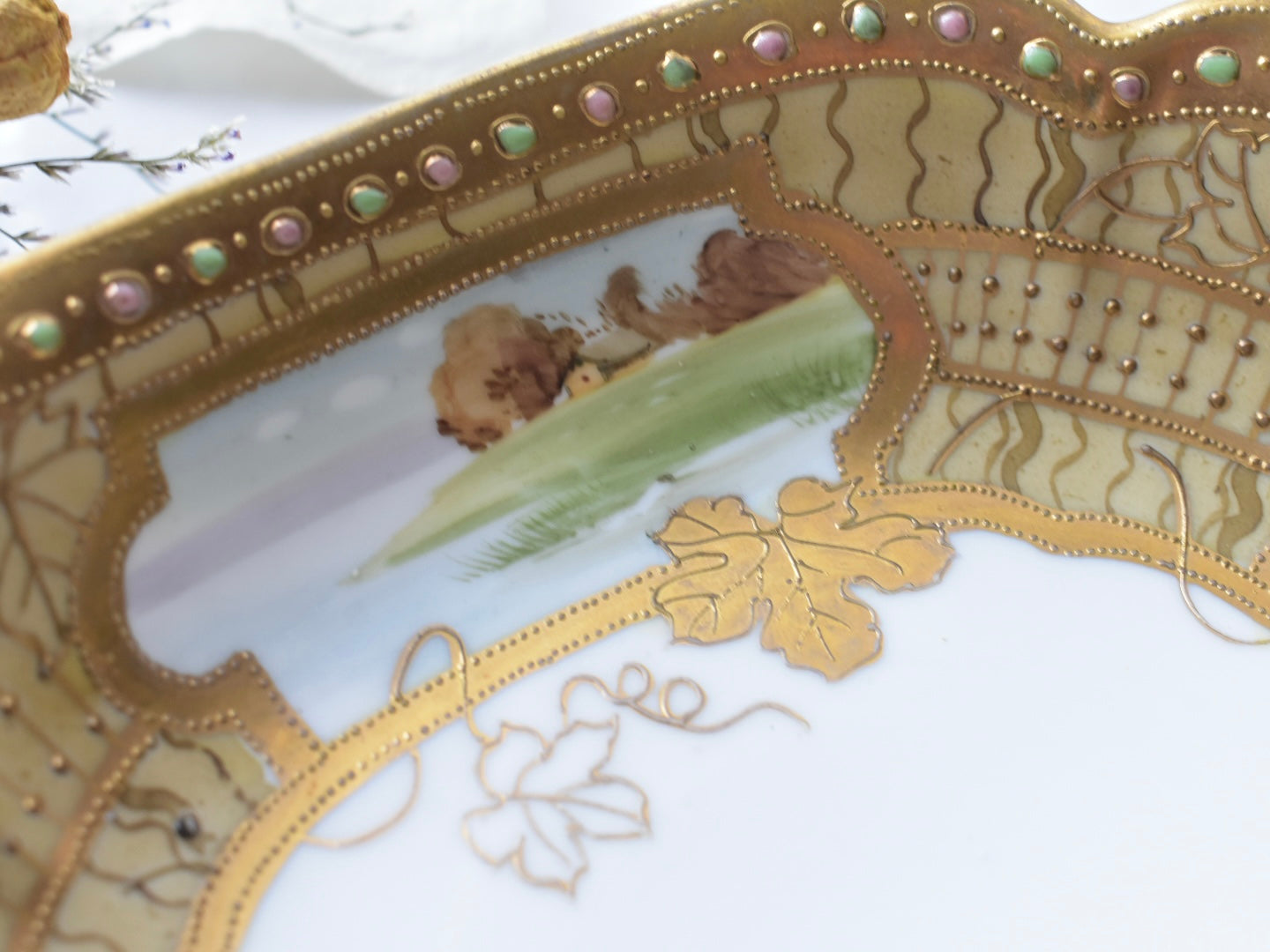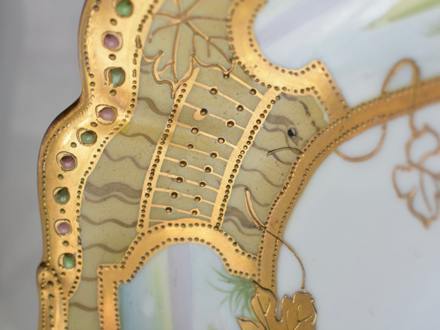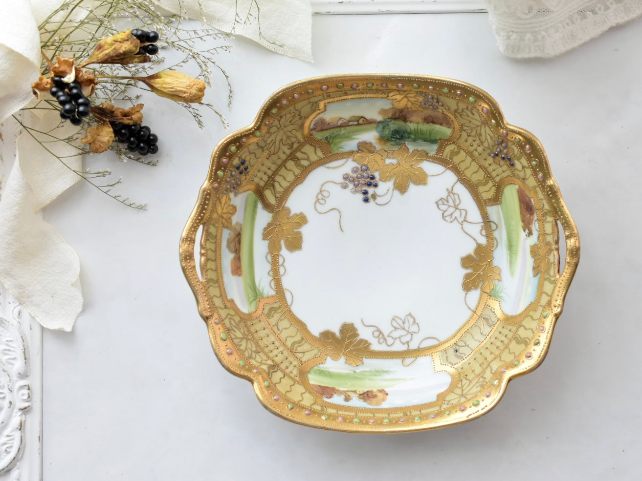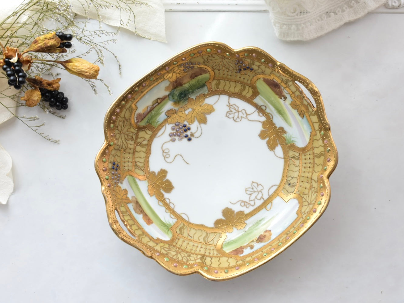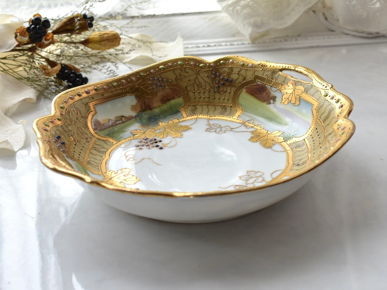器の外縁には贅沢な金彩があしらわれ、四面には風景画が描かれています。そしてその景色の上に重ねられるように配された葡萄の葉と実が、深みを添えています。