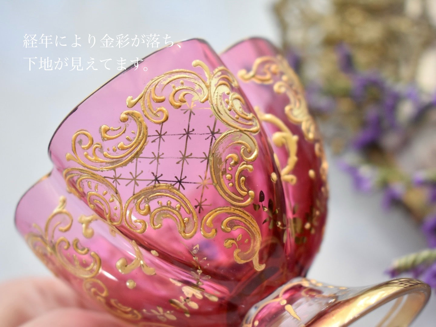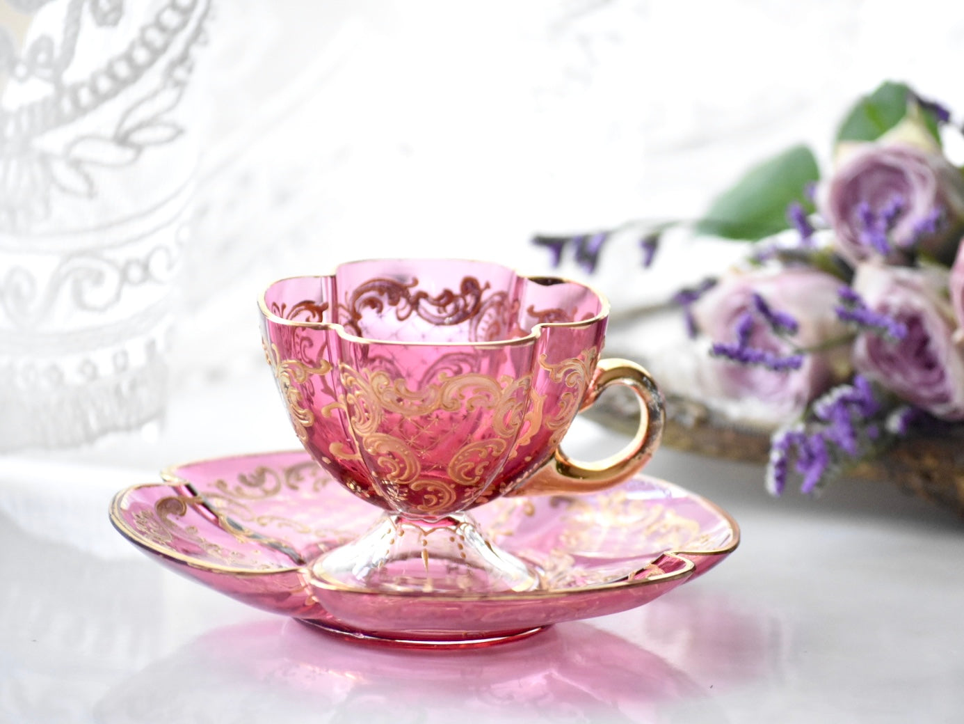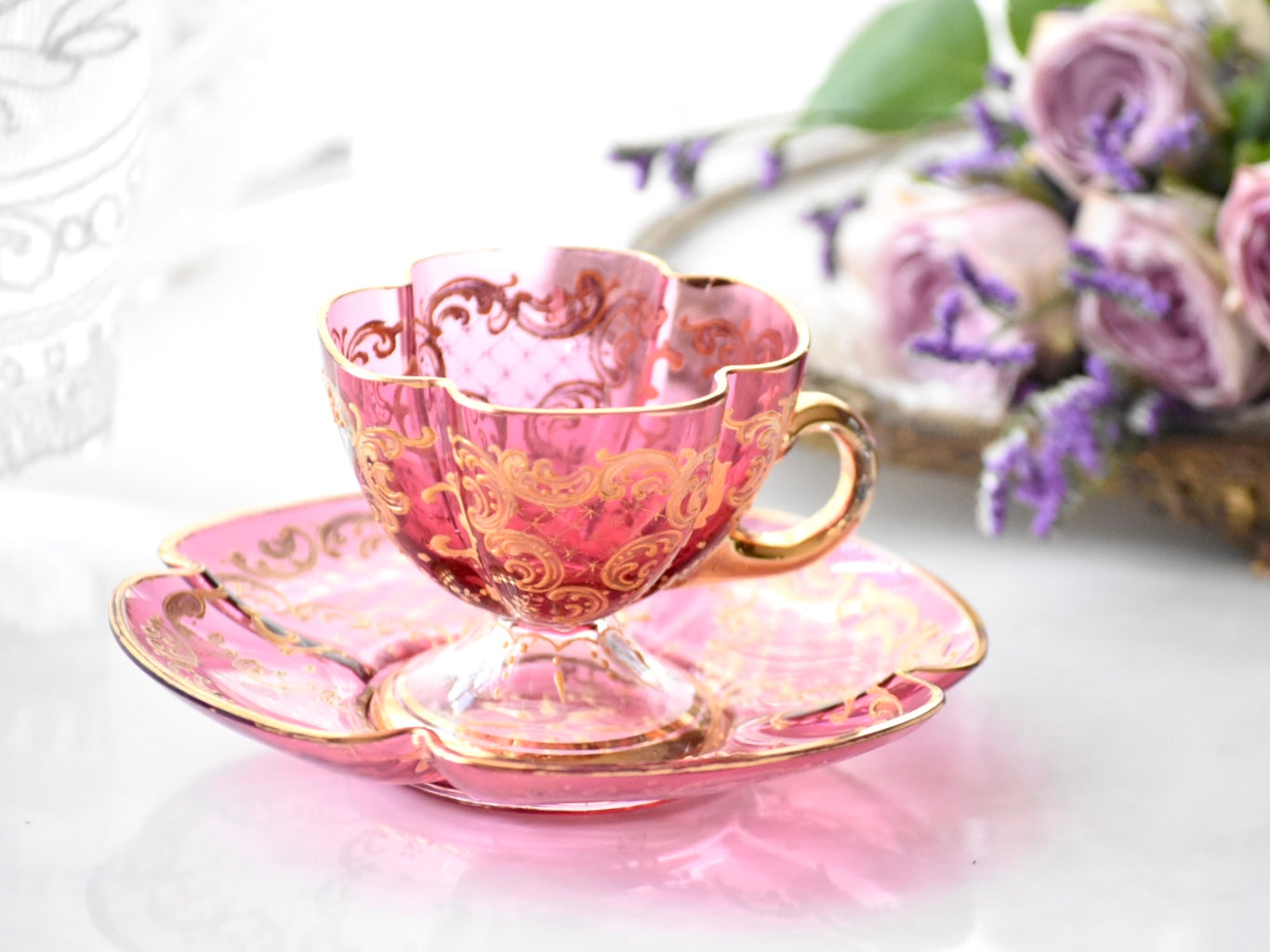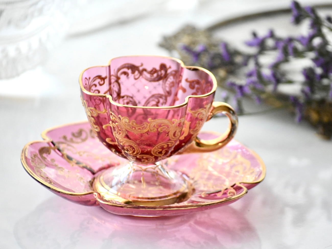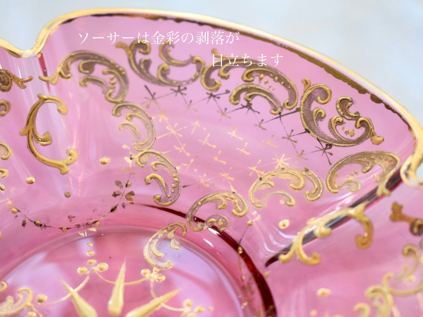 アンティークガラスの中でも、カップ&ソーサーは常に高い人気を誇りますが、とりわけクランベリー色に豪華な金彩が施されたものは、近年ほとんど市場に出回らなくなってきています。