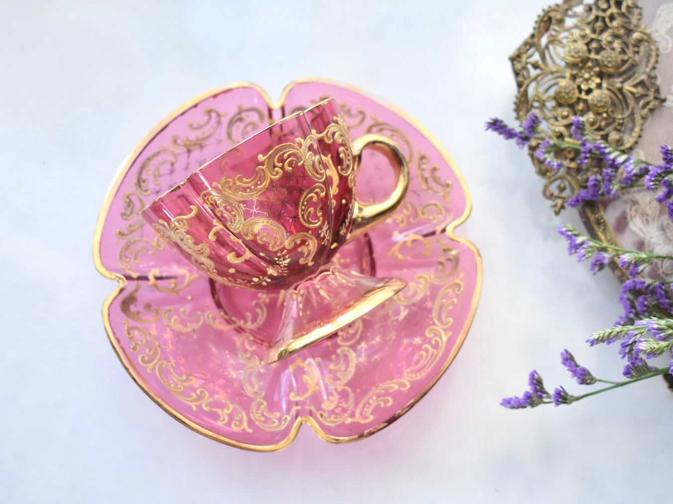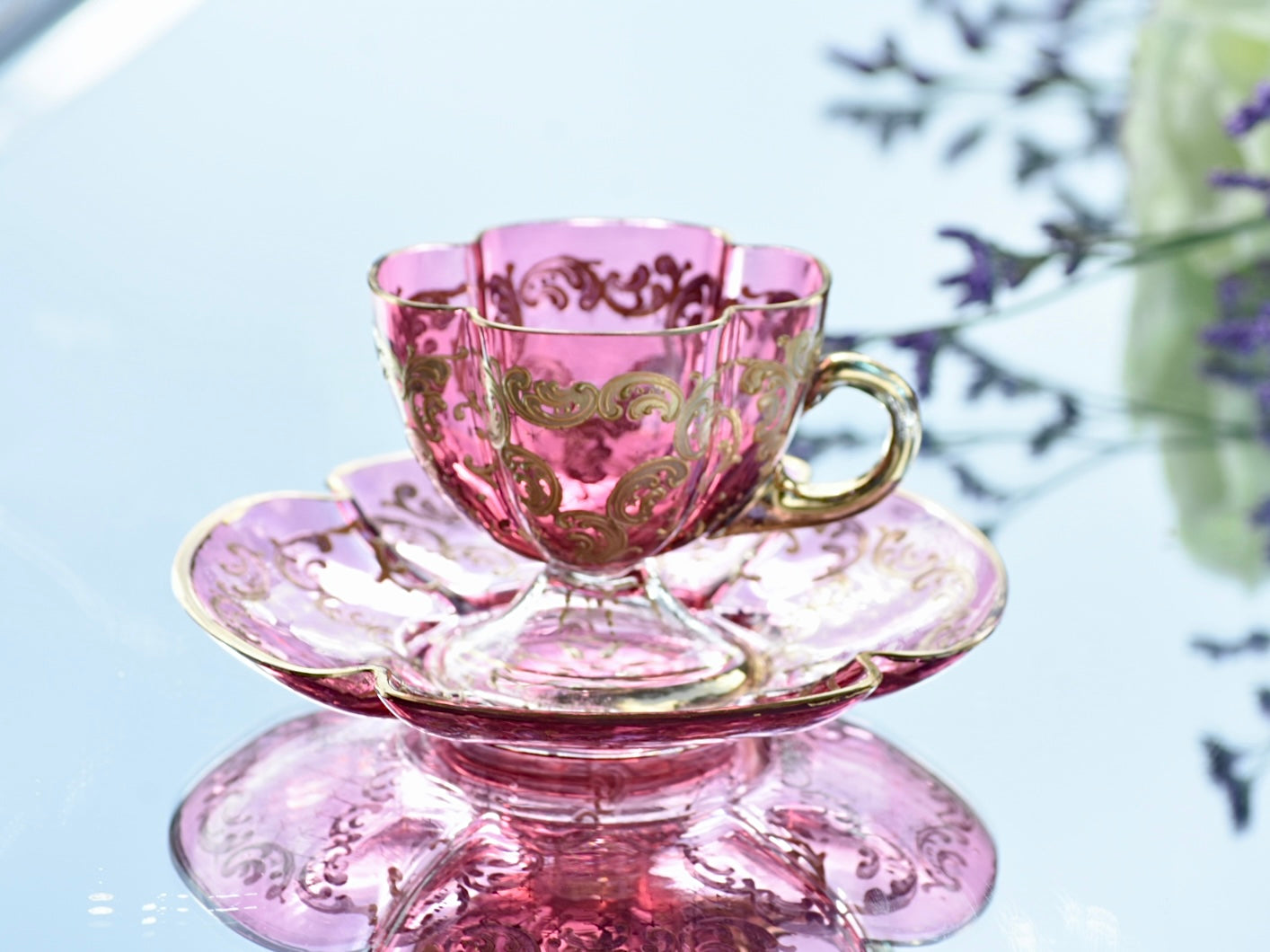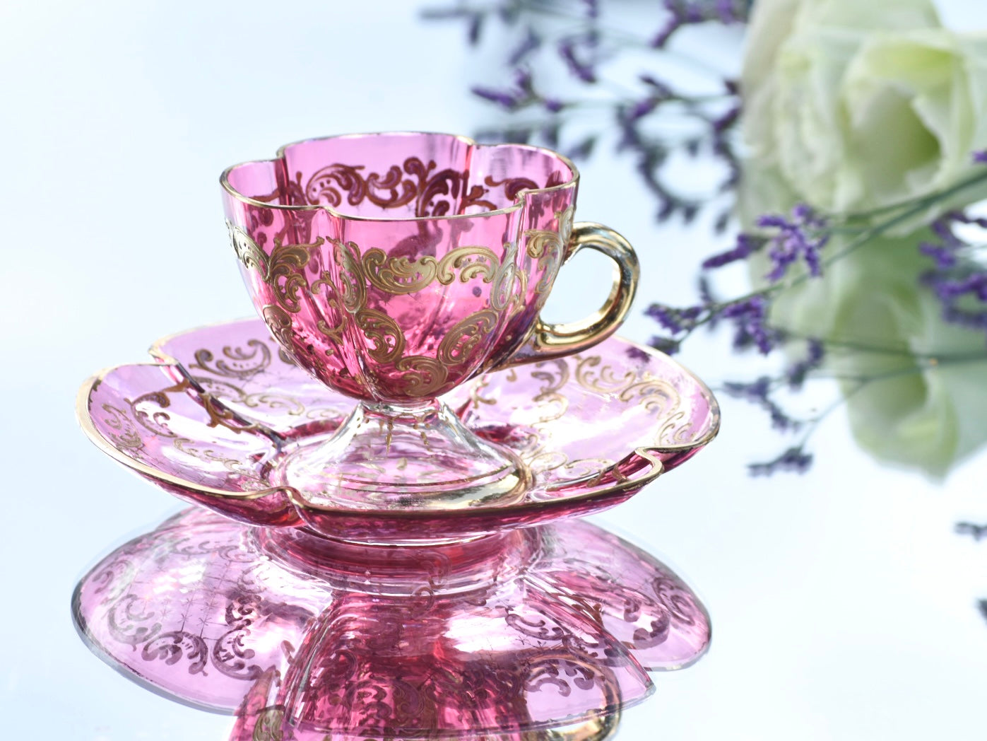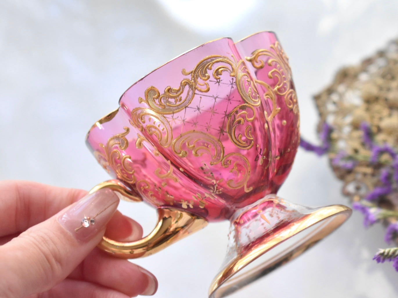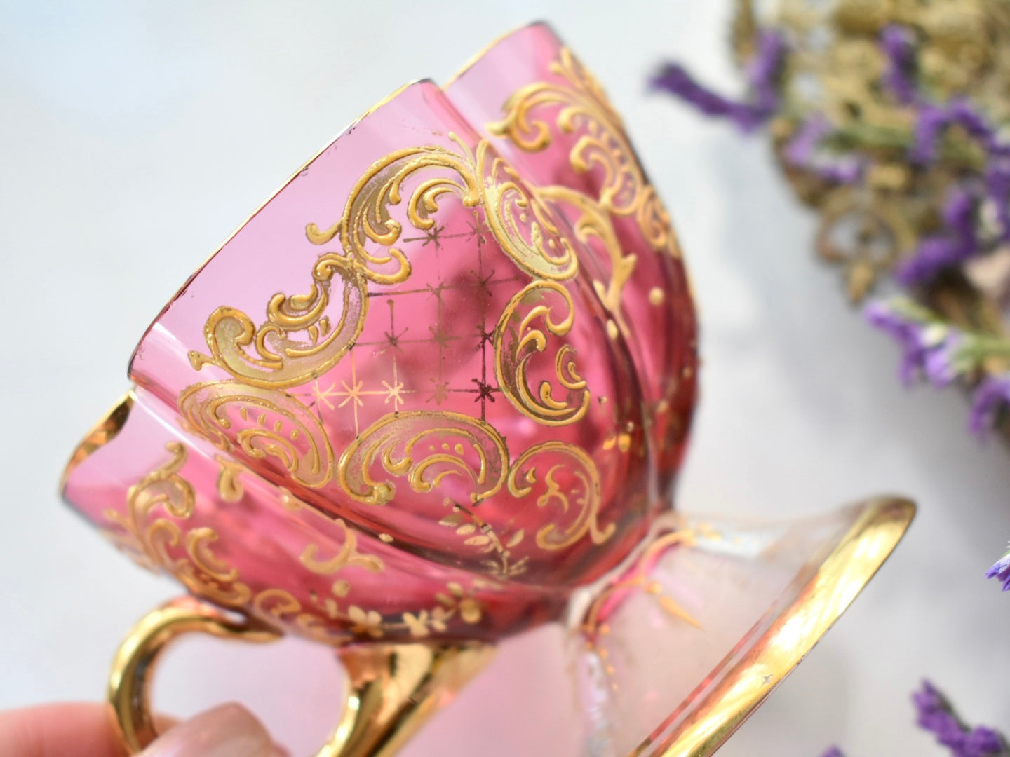 アンティークガラスの中でも、カップ&ソーサーは常に高い人気を誇りますが、とりわけクランベリー色に豪華な金彩が施されたものは、近年ほとんど市場に出回らなくなってきています。