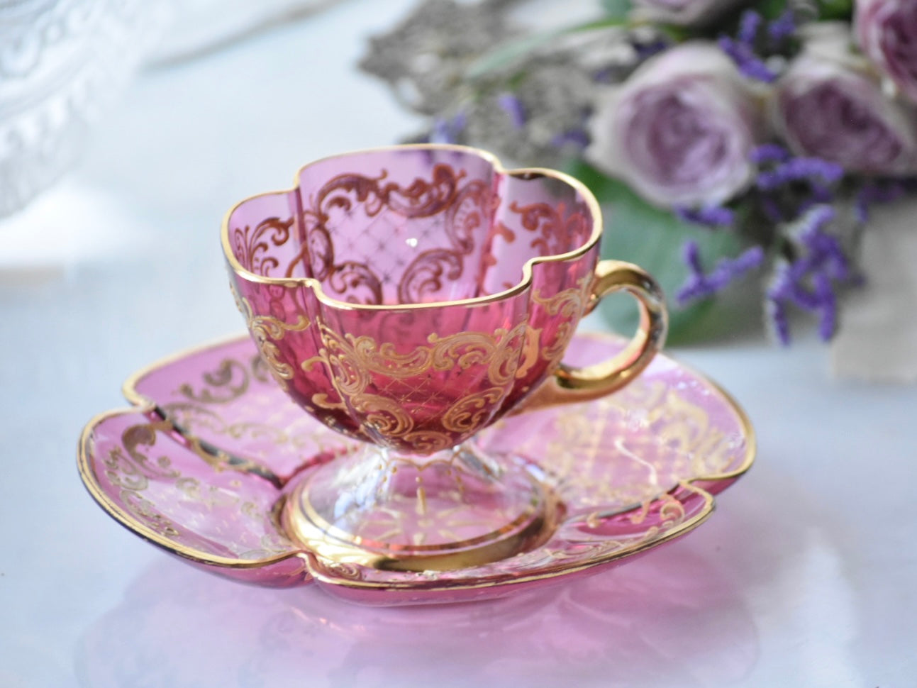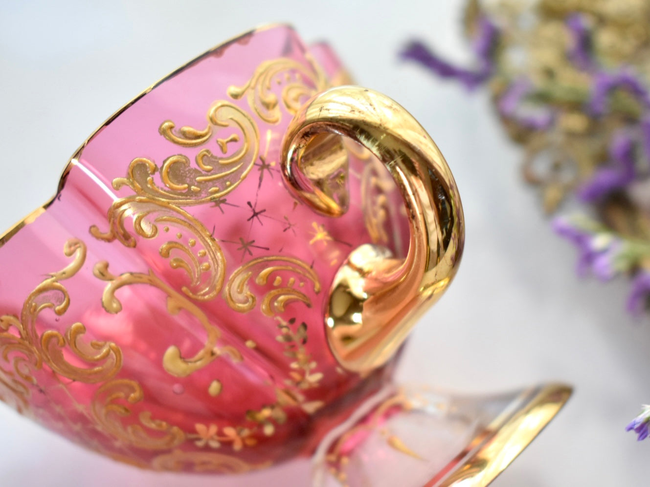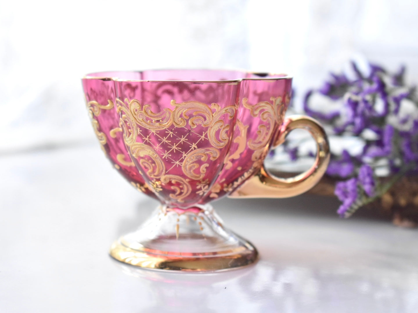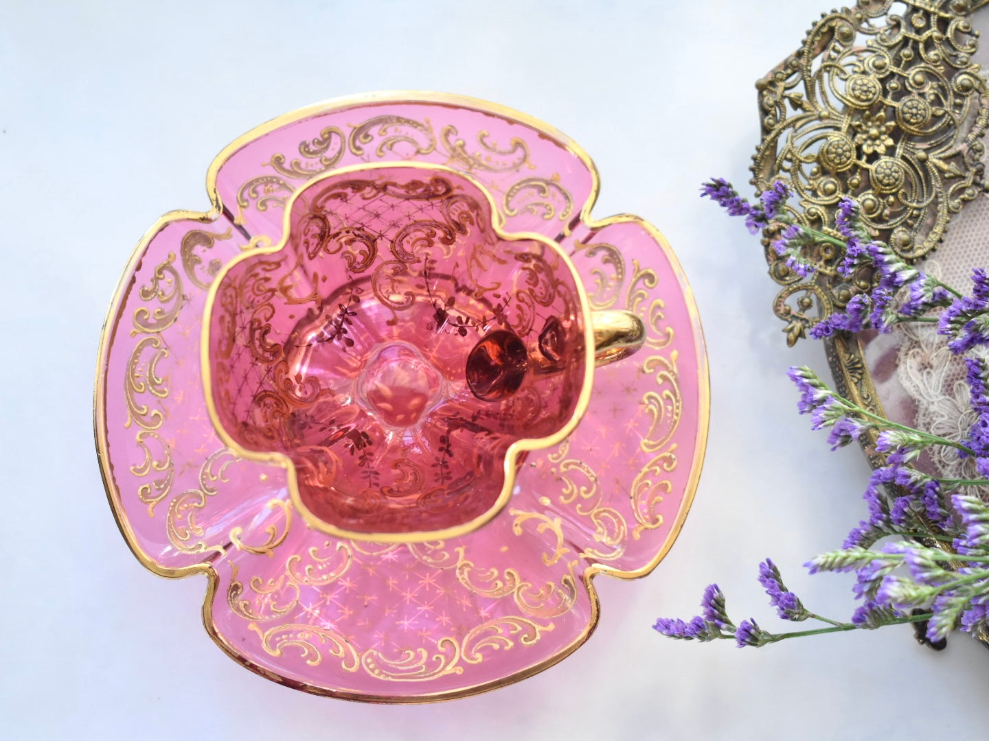 アンティークガラスの中でも、カップ&ソーサーは常に高い人気を誇りますが、とりわけクランベリー色に豪華な金彩が施されたものは、近年ほとんど市場に出回らなくなってきています。