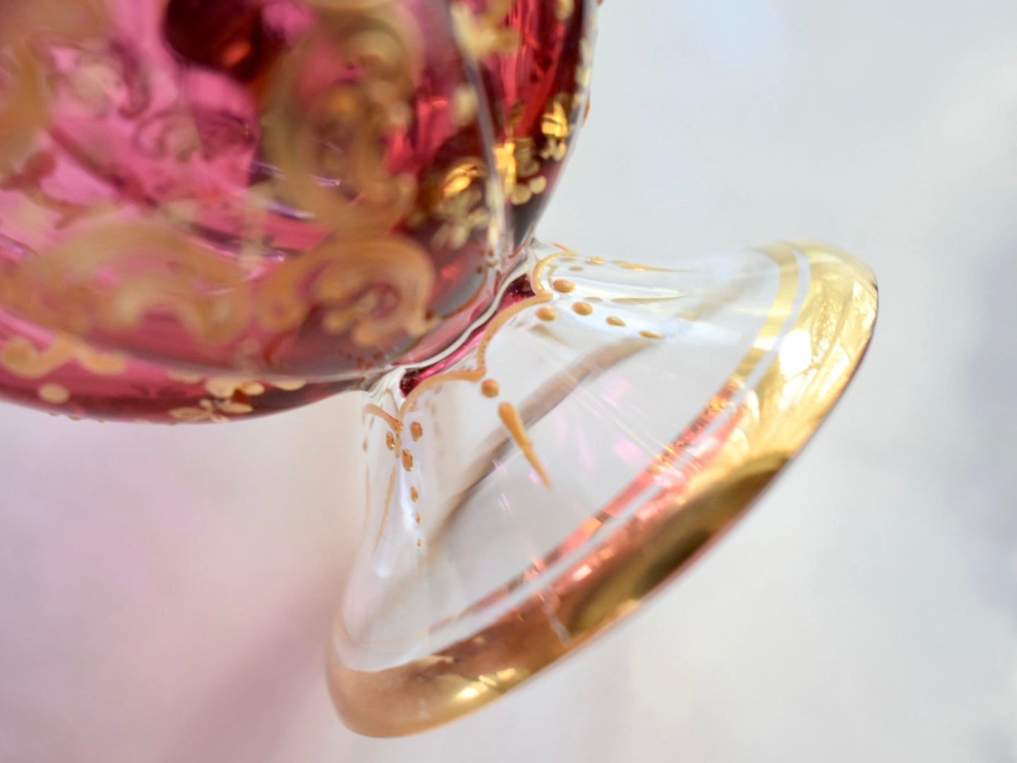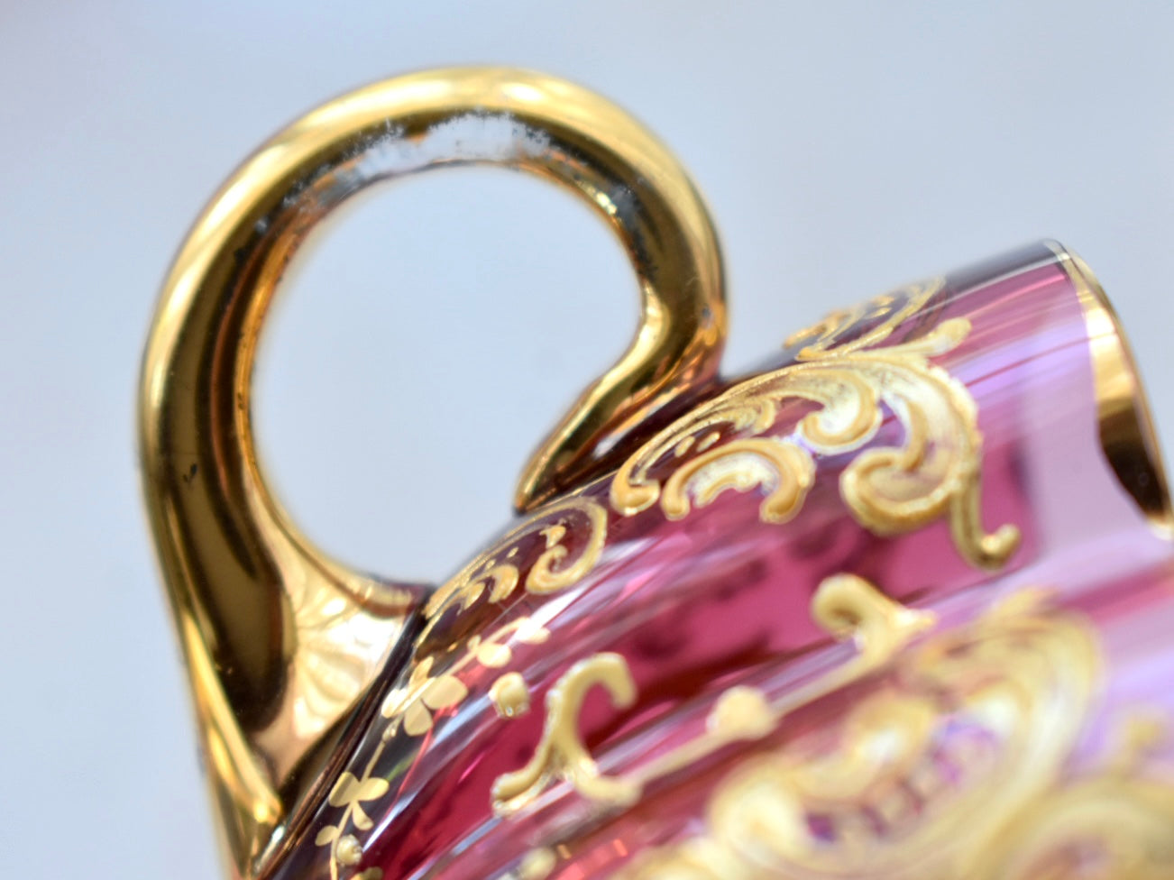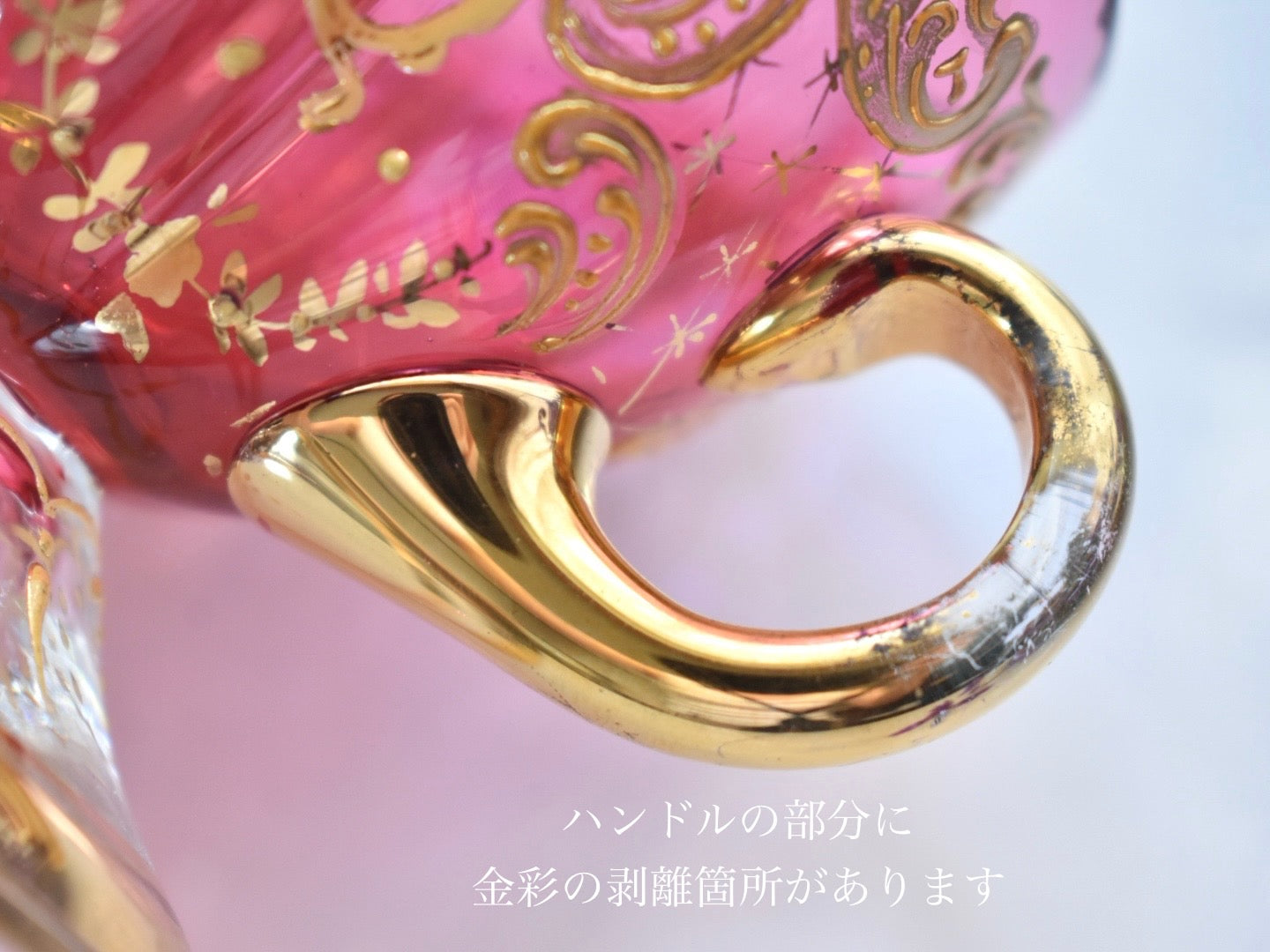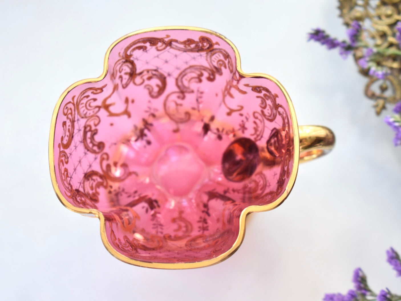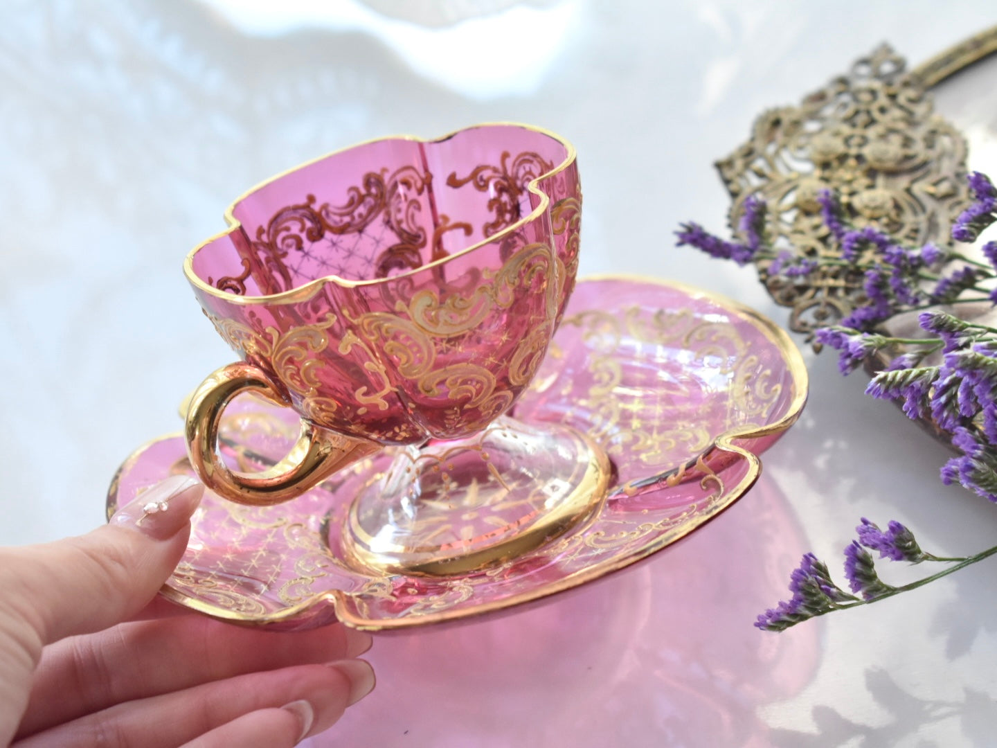 アンティークガラスの中でも、カップ&ソーサーは常に高い人気を誇りますが、とりわけクランベリー色に豪華な金彩が施されたものは、近年ほとんど市場に出回らなくなってきています。