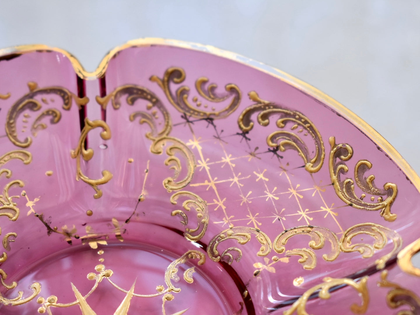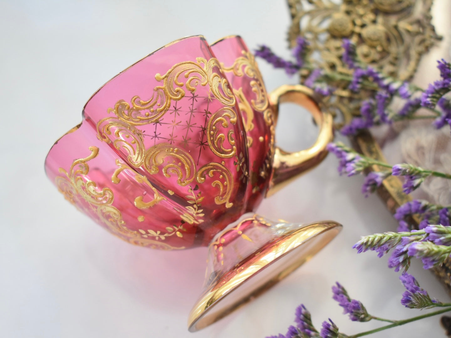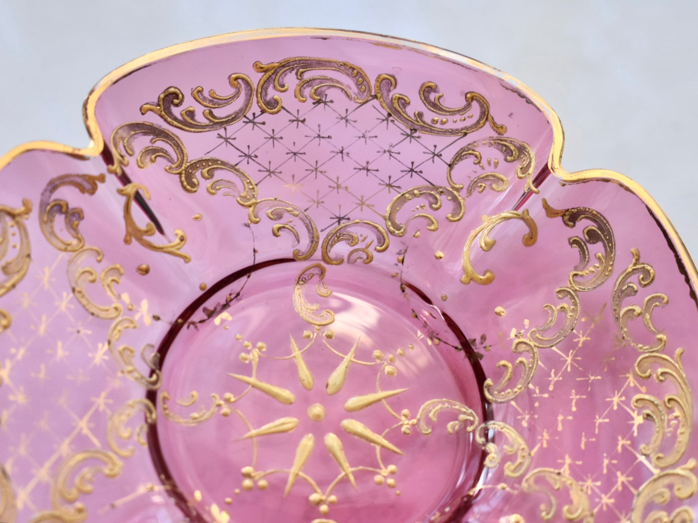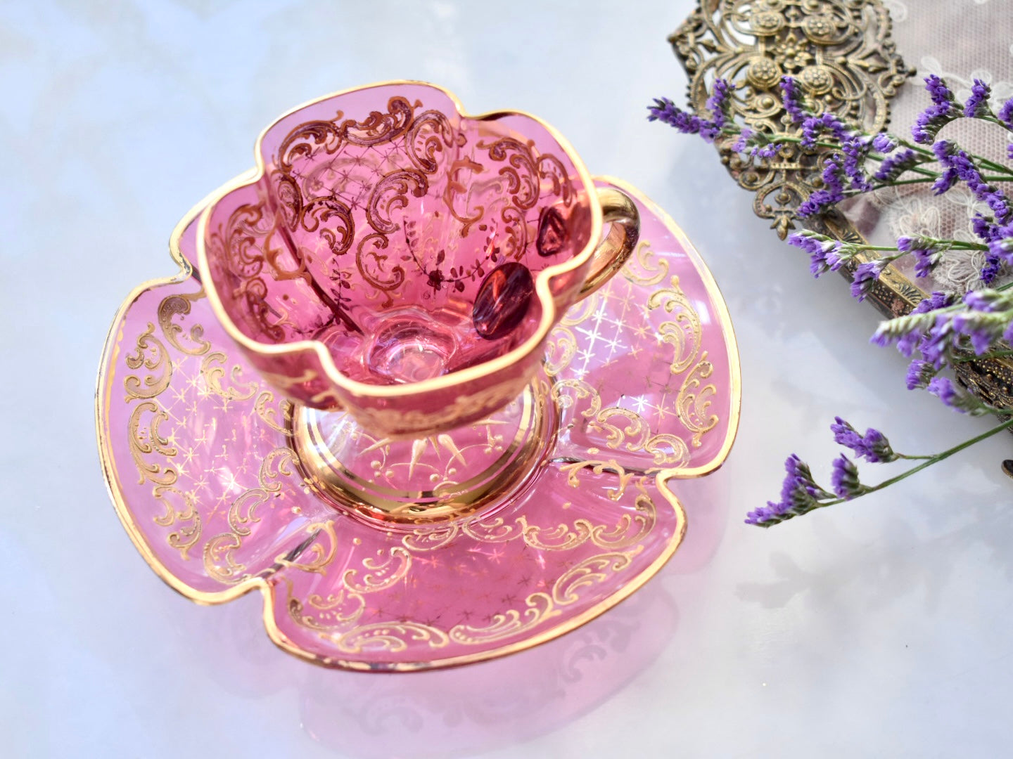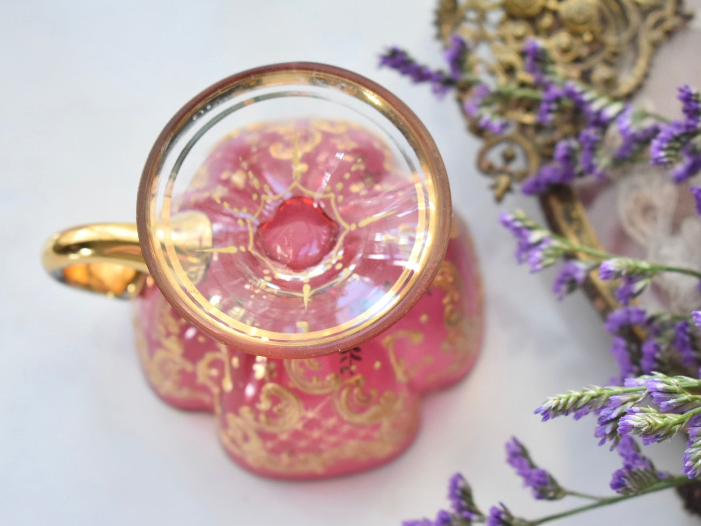 アンティークガラスの中でも、カップ&ソーサーは常に高い人気を誇りますが、とりわけクランベリー色に豪華な金彩が施されたものは、近年ほとんど市場に出回らなくなってきています。