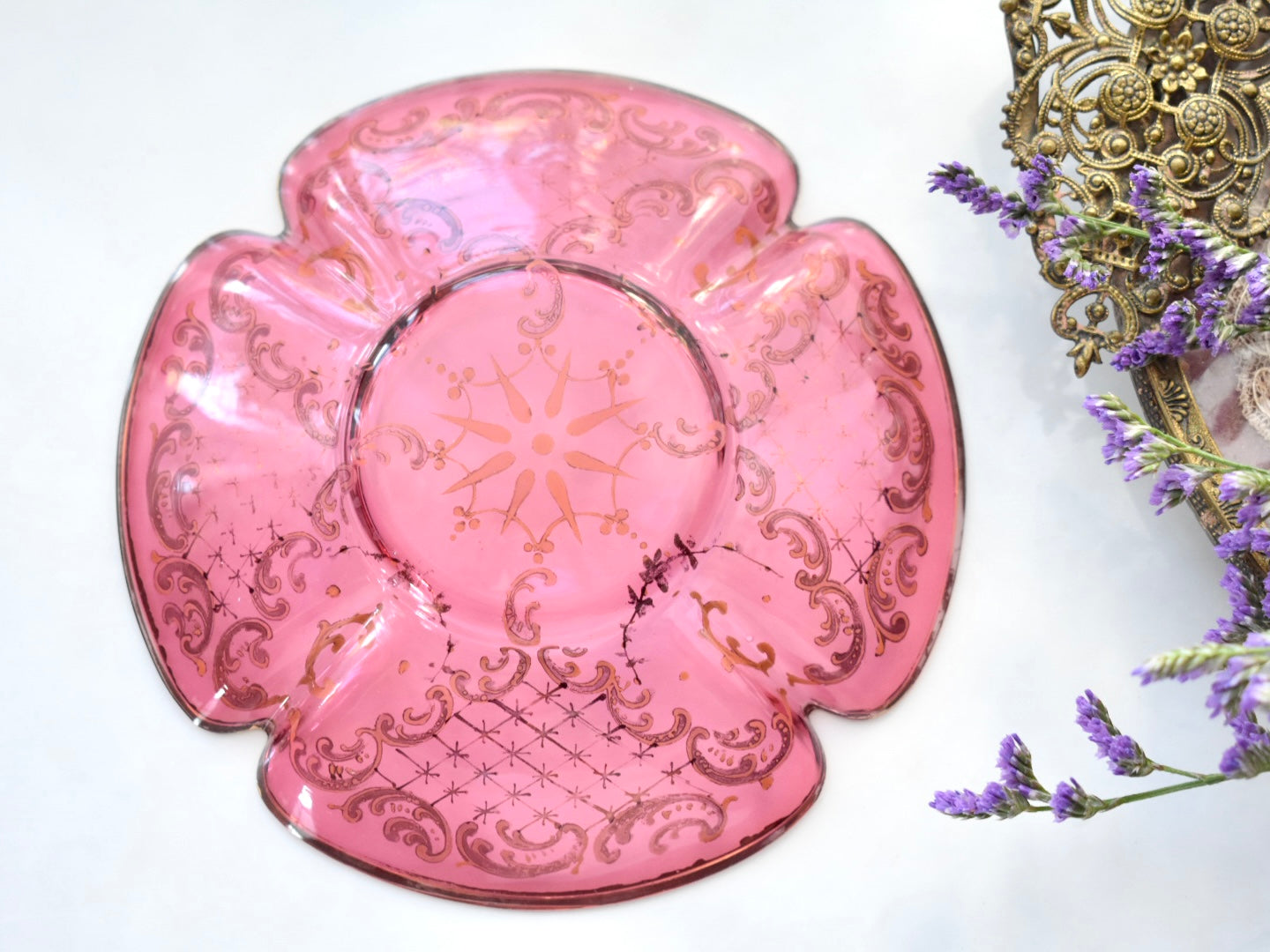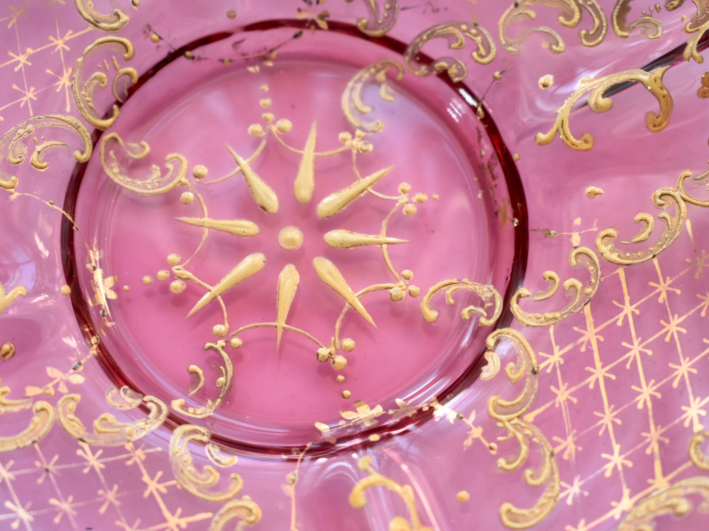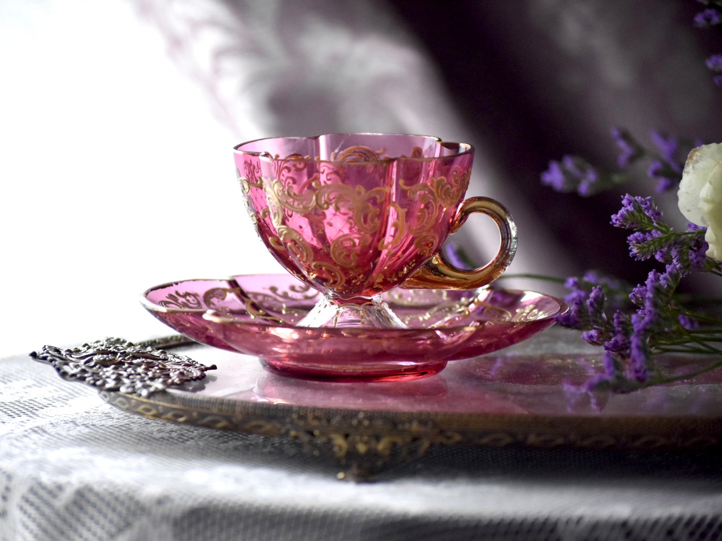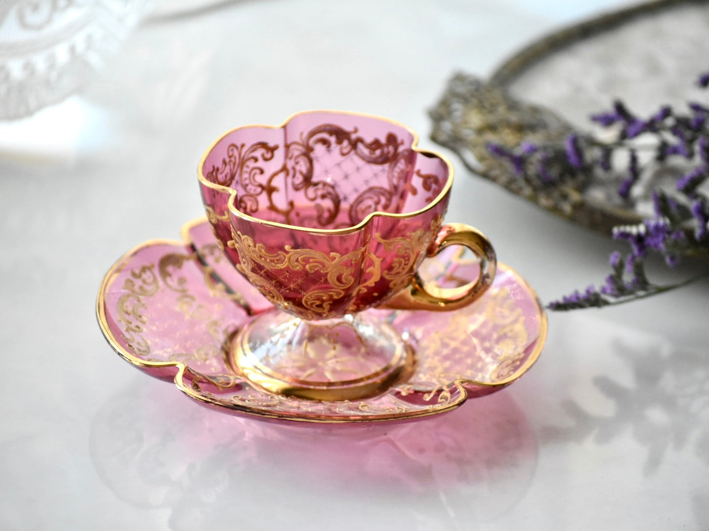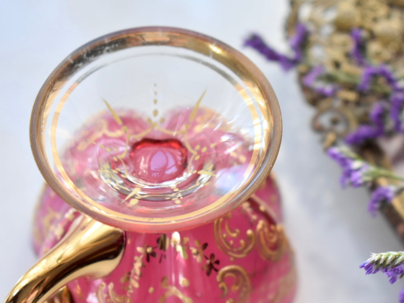 アンティークガラスの中でも、カップ&ソーサーは常に高い人気を誇りますが、とりわけクランベリー色に豪華な金彩が施されたものは、近年ほとんど市場に出回らなくなってきています。