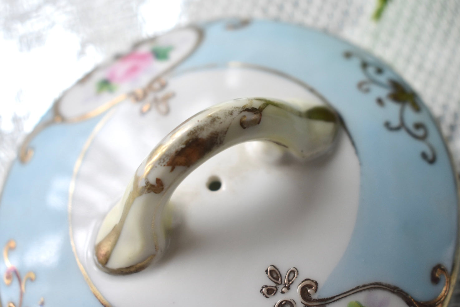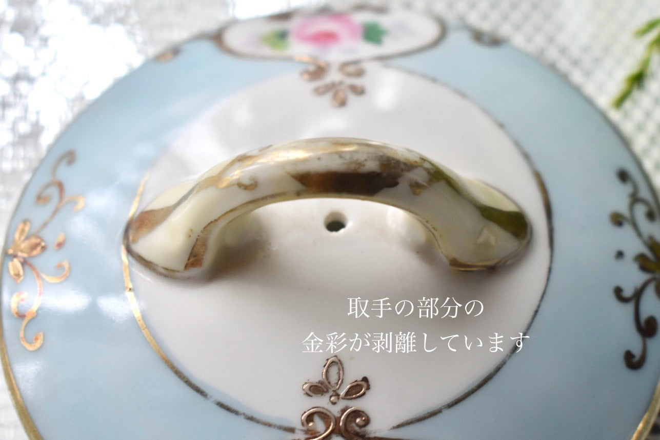 ポット:蓋の取手部分、ポットの縁に金彩の剥離が目立ちます。 一部下地の黄色い部分が出ております。
